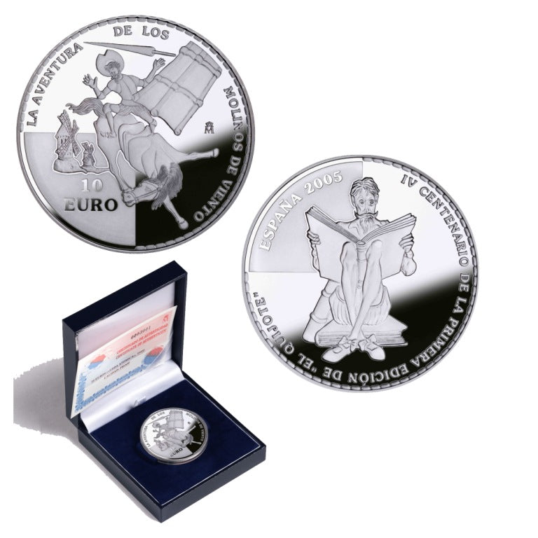 En el anverso común para las monedas de 10 euros se reproduce una imagen de Don Quijote de la Mancha leyendo, sentado sobre unos libros.