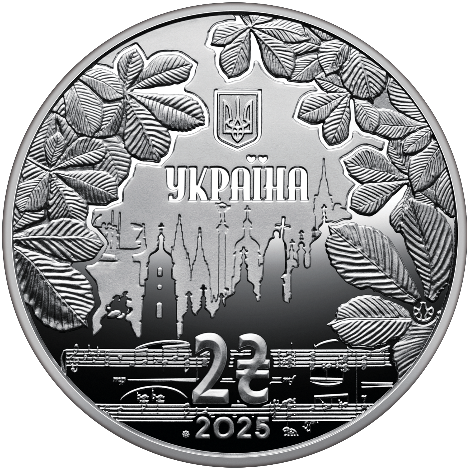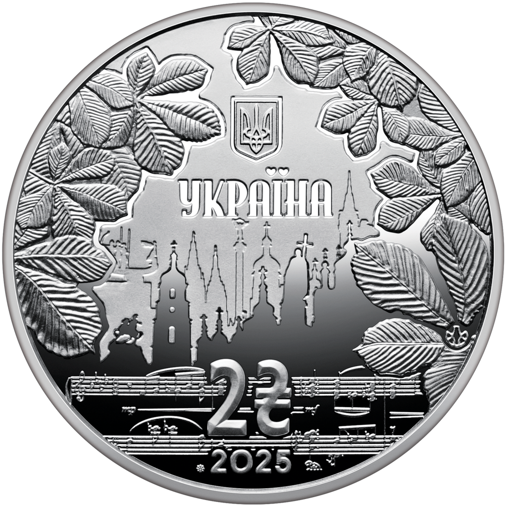 Hay una composición estilizada de paisajes pintorescos, edificios icónicos y monumentos de Kiev, enmarcados por hojas de castaño, un sello simbólico de la capital. Debajo, en un fondo suave, hay una hoja de música con una de las composiciones musicales de Shamo, el valor nominal de la moneda 2, el símbolo gráfico de la hryvnia, y el año de emisión de la moneda: 2025. Arriba, en el centro están el pequeño escudo de armas de Ucrania y la leyenda УКРАЇНА (Ucrania) (los puntos por encima de la letra ucraniana “ї” están hechos para parecerse a corazones). Debajo, a la derecha, está la marca de la casa de la moneda de la NBU de las obras de impresión y acuñación de billetes.