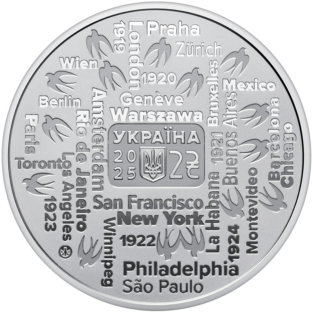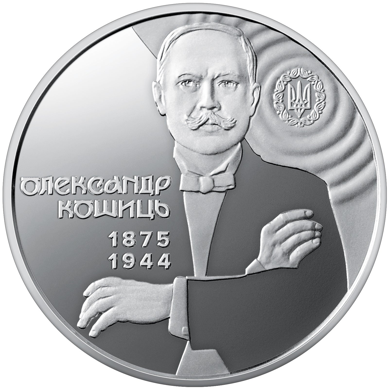 • Esta moneda celebra al prominente director coral ucraniano, compositor, etnógrafo y educador, Oleksandr Koshyts (1875–1944), quien desempeñó un papel clave en la popularización de la cultura musical ucraniana en el escenario internacional. La moneda honra el legado creativo del artista que, por invitación de Symon Petliura, jefe de la Dirección de la República Popular Ucraniana, dirigió el Coro Republicano Ucraniano. De 1919 a 1924, bajo la dirección de Koshyts, el coro realizó 17 países, dando más de 600 conciertos. Fue durante esta gira que el mundo escuchó por primera vez “Shchedryk” de Mykola Leontovych, una pieza que más tarde se convertiría en el famoso éxito de Navidad, “The Carol of the Bells”.