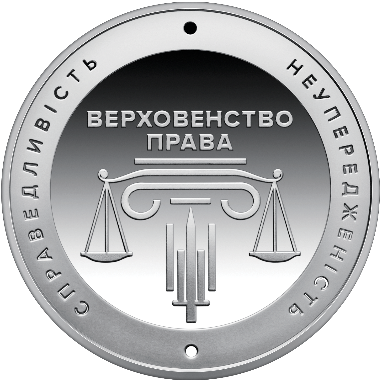 Reverso: en un contexto suave está la leyenda ВЕРХОВЕНСТВО ПРАВА (el Estado de Derecho), que refleja el principio central que guía a las autoridades públicas en un estado democrático y legal. Debajo de ella, una composición presenta una columna, que simboliza la estabilidad, la inviolabilidad y el orden legal, rematado con la balanza de la justicia. El aceitado de la columna se representa como un tridente estilizado, integrando una espada que representa el poder de la ley, la verdad y la protección. Rodear la moneda contra un fondo mate son las leyendas СПРАВЕДЛИВІСТЬ (justicia) y НЕУПЕРЕДЖЕНІСТЬ (imparcialidad) – los principios fundamentales de la justicia administrativa. Estas leyendas están separadas por elementos decorativos estilizados en forma de círculos.