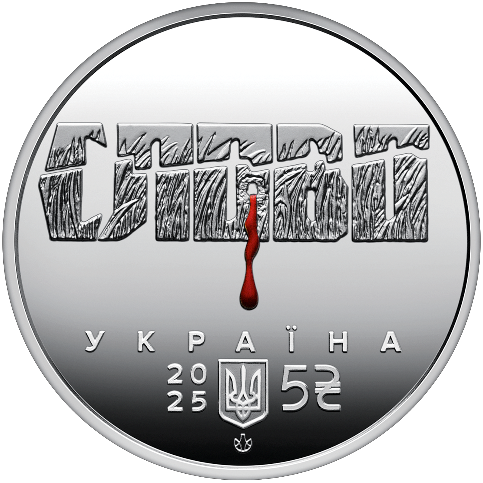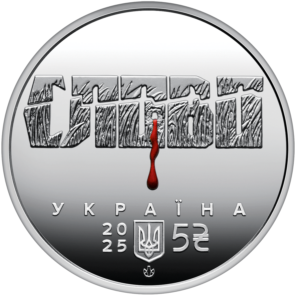 Anverso: hay una leyenda СЛОВО estilizada (que significa “palabra” en ucraniano), el nombre de la Casa de Escritores de Járkov de los años treinta. La textura de las cartas muestra un brote de trigo de invierno, una imagen de la generación más joven de artistas cuyas vidas y obras fueron destruidas despiadadamente por el gobierno totalitario. La tragedia de la era histórica se enfatiza por el disparo a través de la letra “O”, que está sangrando, recordándonos una herida dolorosa en la historia de Ucrania y los sueños incumplidos de artistas talentosos. Bajo la composición del texto se encuentran la leyenda УКРАЇНА (Ucrania), el año de emisión de la moneda: 20 / 25, el pequeño escudo de armas de Ucrania, el valor nominal de la moneda 5, el símbolo gráfico de la hryvnia y la marca de menta de las obras de impresión y acuñación de billetes de la NBU.