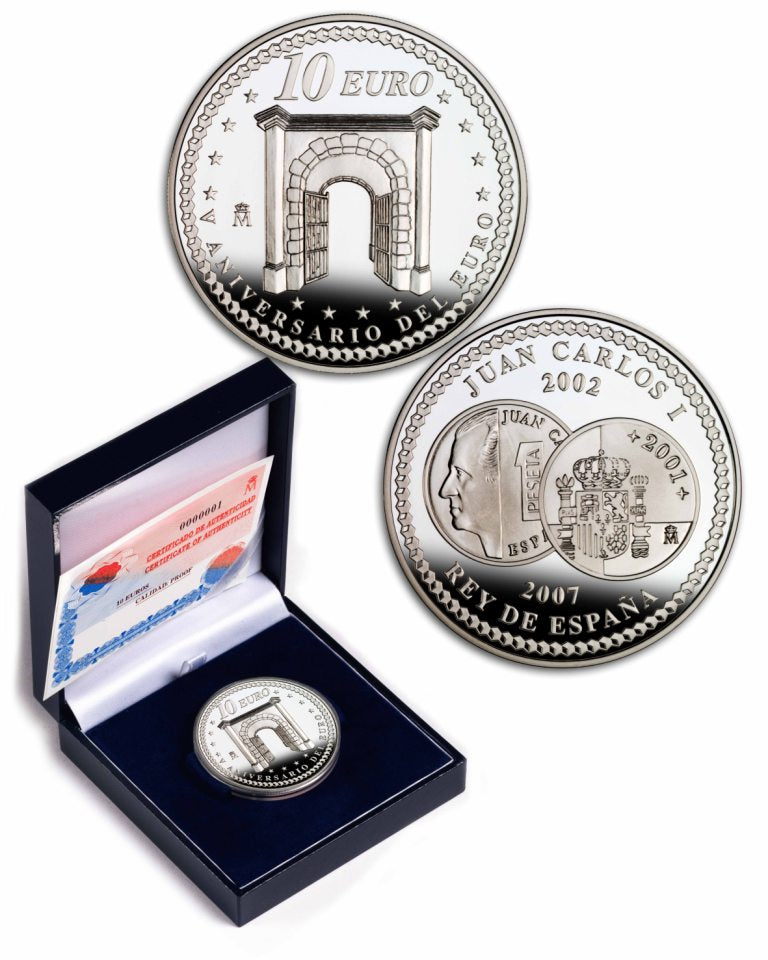 En el anverso (común para las tres piezas de valor facial 10 euros), en la parte central de la moneda, se reproducen el anverso y el reverso de una moneda de 1 peseta de 2001, última emisión denominada en pesetas.