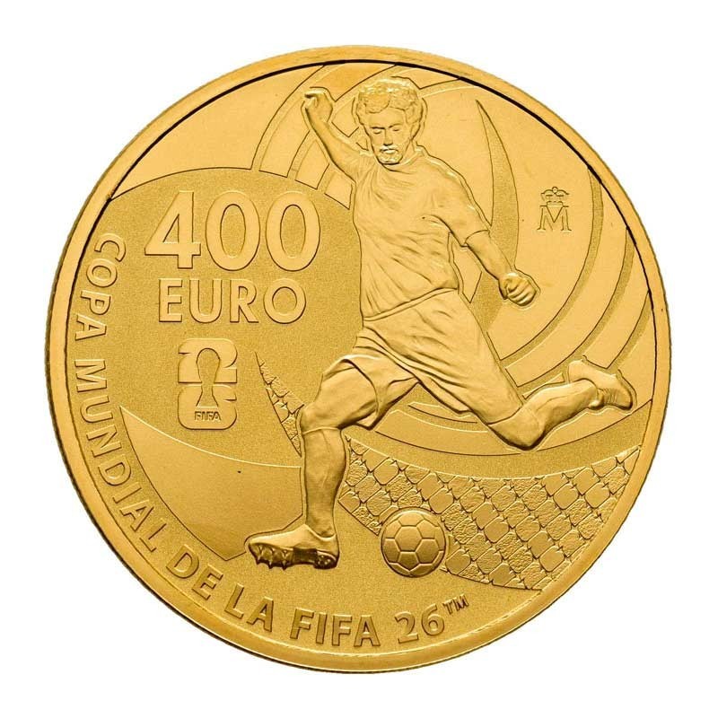 Anverso de la moneda representa a un futbolista chutando un balón junto al logotipo oficial del campeonato. A la izquierda figura el valor facial de 400 EURO y el emblema del torneo, mientras que a la derecha se encuentra la marca de Ceca. En la parte inferior, en disposición circular y en mayúsculas, aparece la leyenda COPA MUNDIAL DE LA FIFA 26™.